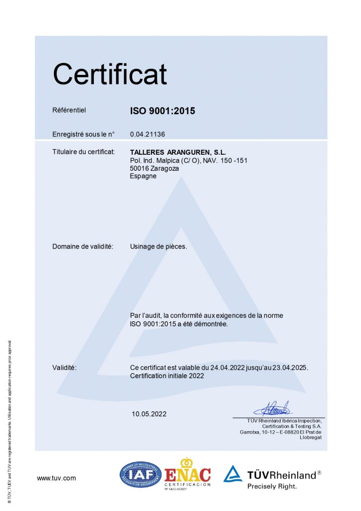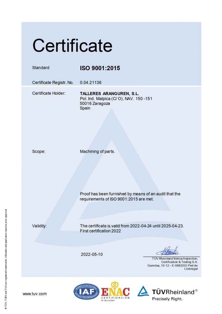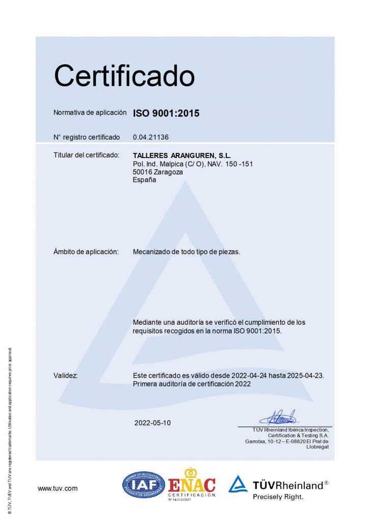 TALLERES ARANGUREN S.L. cuenta con la certificación de calidad según la norma ISO 9001:2015 , para el alcance:  Mecanizado de todo tipo de piezas, otorgado por TÜV Rheinland